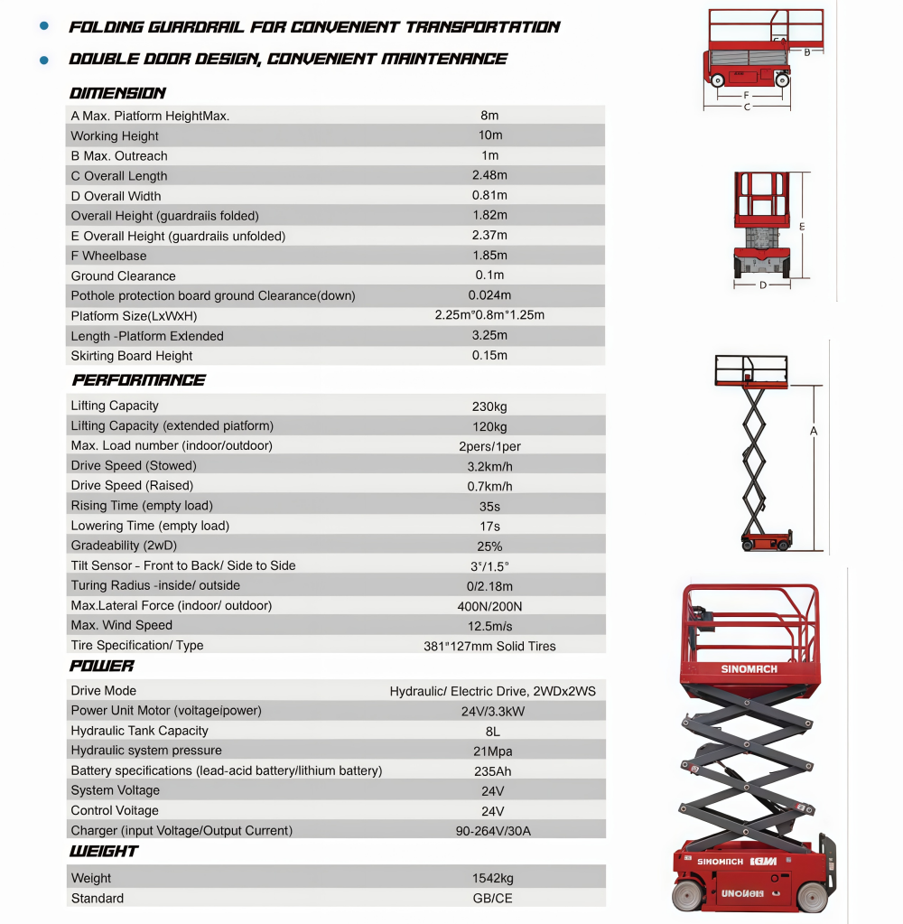 The overall weight of the GKX80E scissor lift may vary depending on optional configurations and different regional standards. Please confirm specifications with your supplier before purchase.